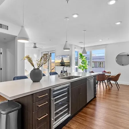 Die 121 m² große Ferienwohnung Amethyst Sky Loft - Elevated Two-Story Waterfront Los Angeles befindet sich im Stadtteil Marina Del Rey, in circa 25 Gehminuten Entfernung vom Venice Beach. Lediglich 650 Meter vom Marina Beach entfernt bietet dieses Apartment eine Terrasse mit einem Swimmingpool.